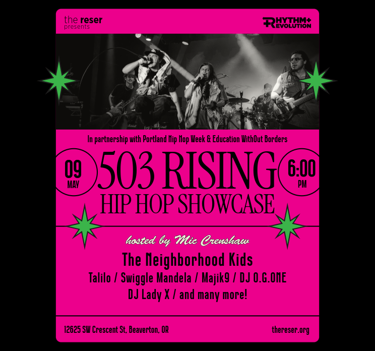 The Reser, in partnership with Portland Hip Hop Week and Education WithOut Borders, is proud to present the 503 RISING Hip Hop Showcase.…